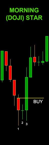 boleh ada upper shadow namun panjangnya tidak seberapa.MORNING DOJI STAR